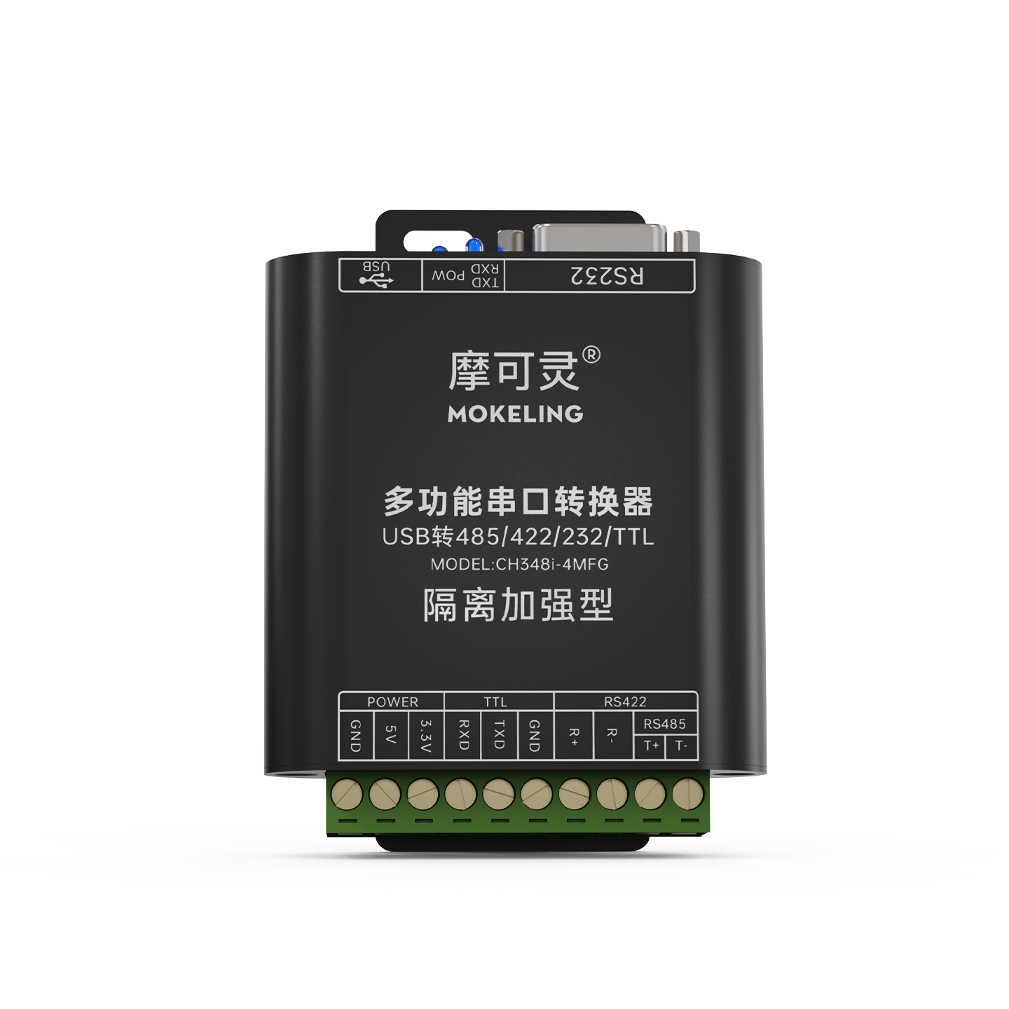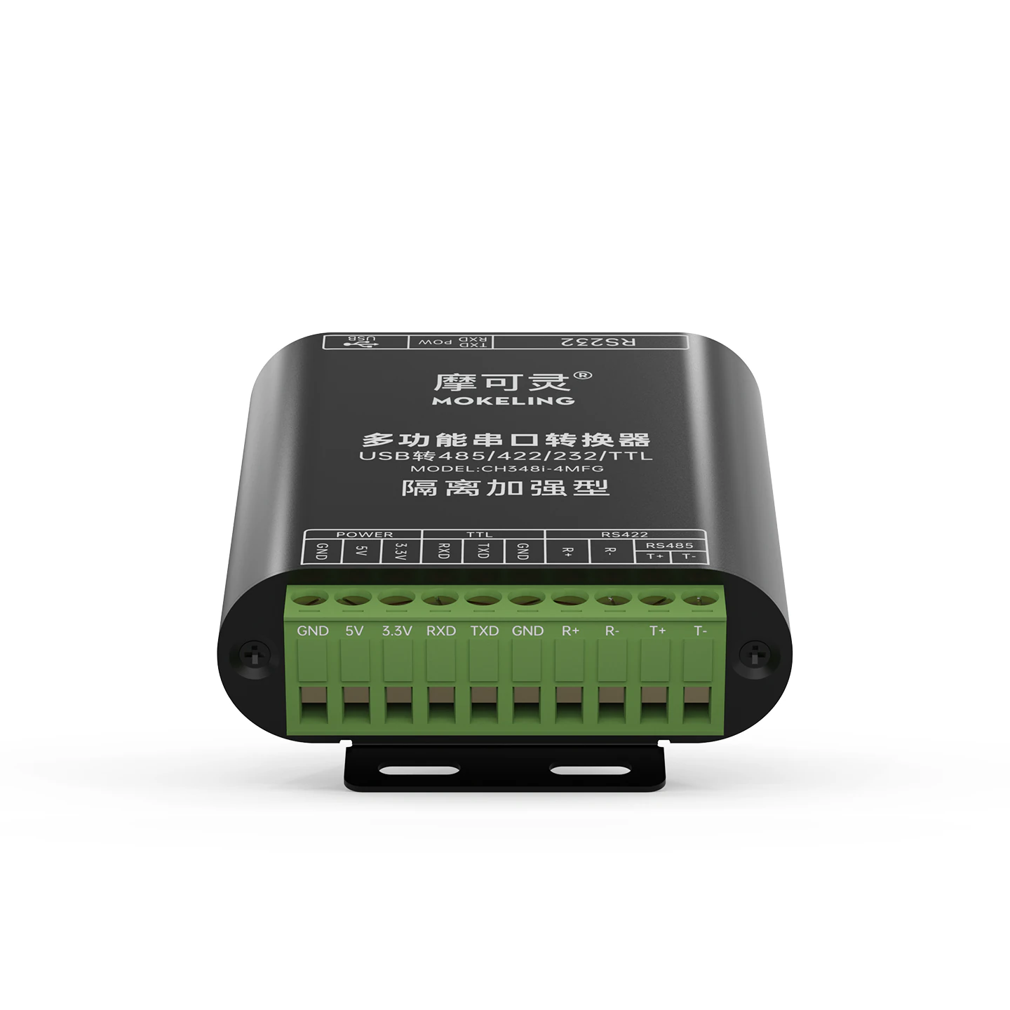 摩可灵 CH348i 系列多功能串口转换器,一台设备集成 RS-232、RS-485、RS-422、TTL 四种串口协议转换能力,同时提供 5V 和 3.3V 带过流保护的电源输出,覆盖工业现场几乎全部串口通信场景。