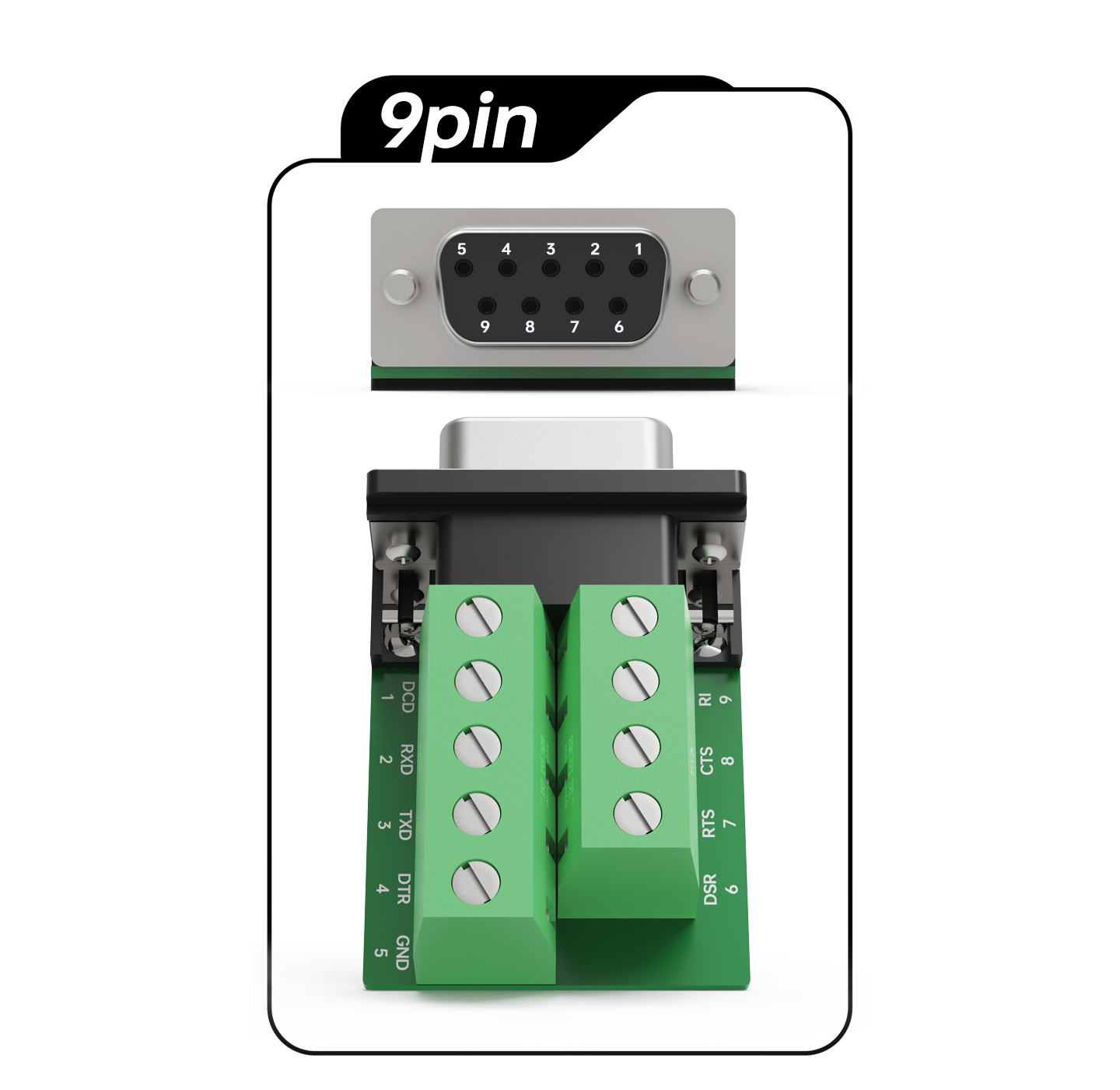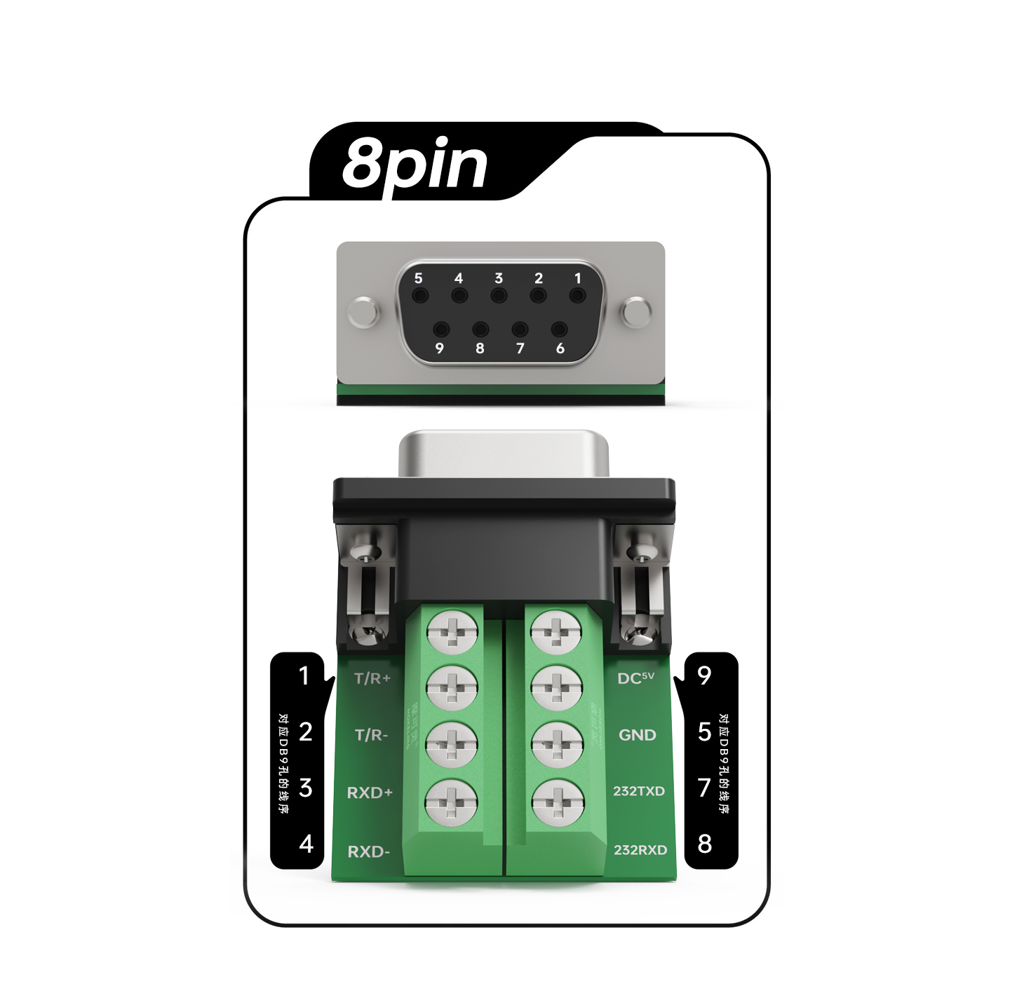 提供 5位、6位、8位、9位、10位五种规格,对应不同协议与引脚需求——5位、6位适配 RS-485 / RS-422 差分信号线路,8位、9位对应 RS-232 标准引脚,10位适用于需要额外信号或屏蔽接地的扩展场景。端子孔位按引脚顺序标注,接线位置一目了然,不易出错。